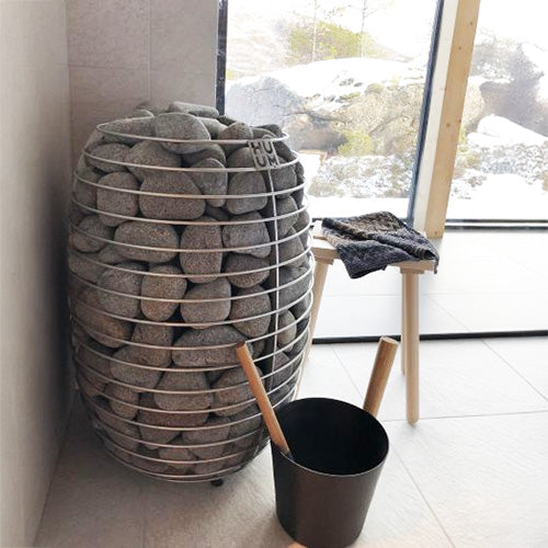 The HUUM HIVE 18kW sauna heater  provides modern elegance for larger saunas like those in health clubs, spas, and gyms. This floor-mounted heater is engineered to hold 528 lbs of stones for unmatched efficiency and performance in sauna rooms up to 1,236 cubic feet (CF).