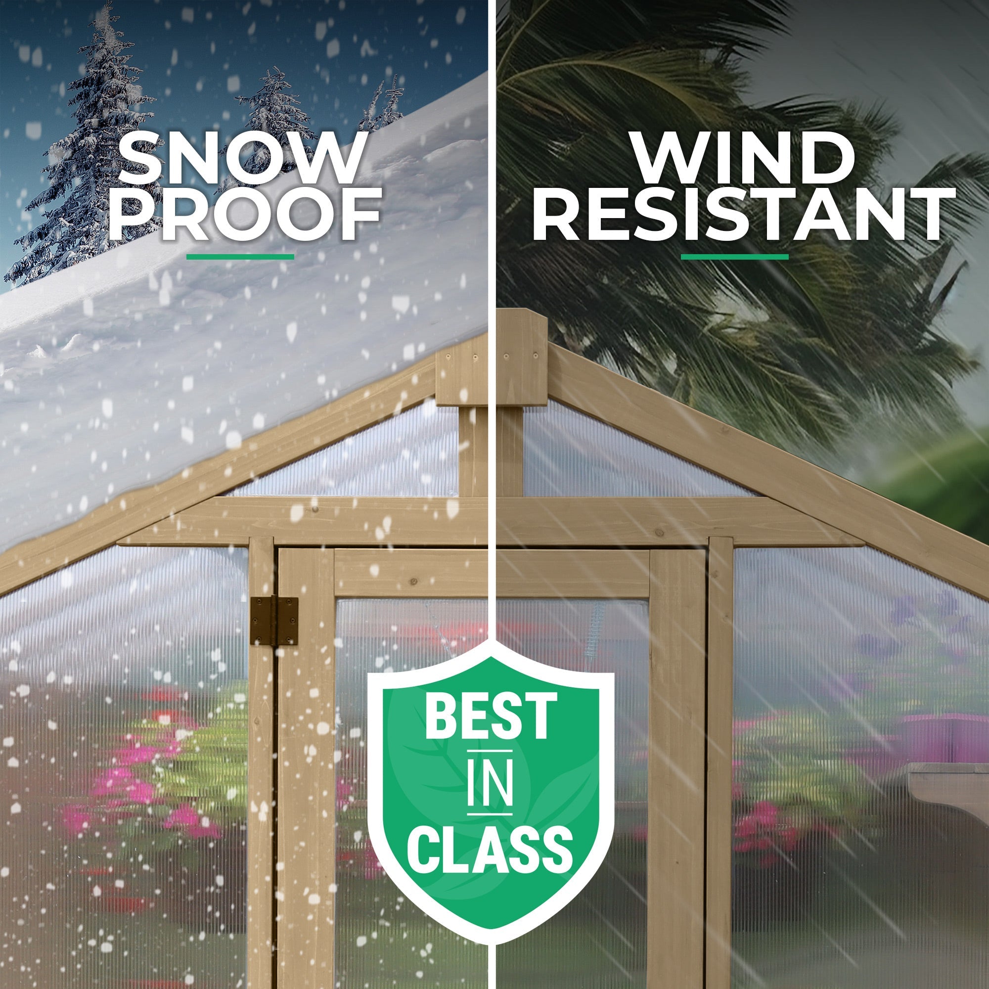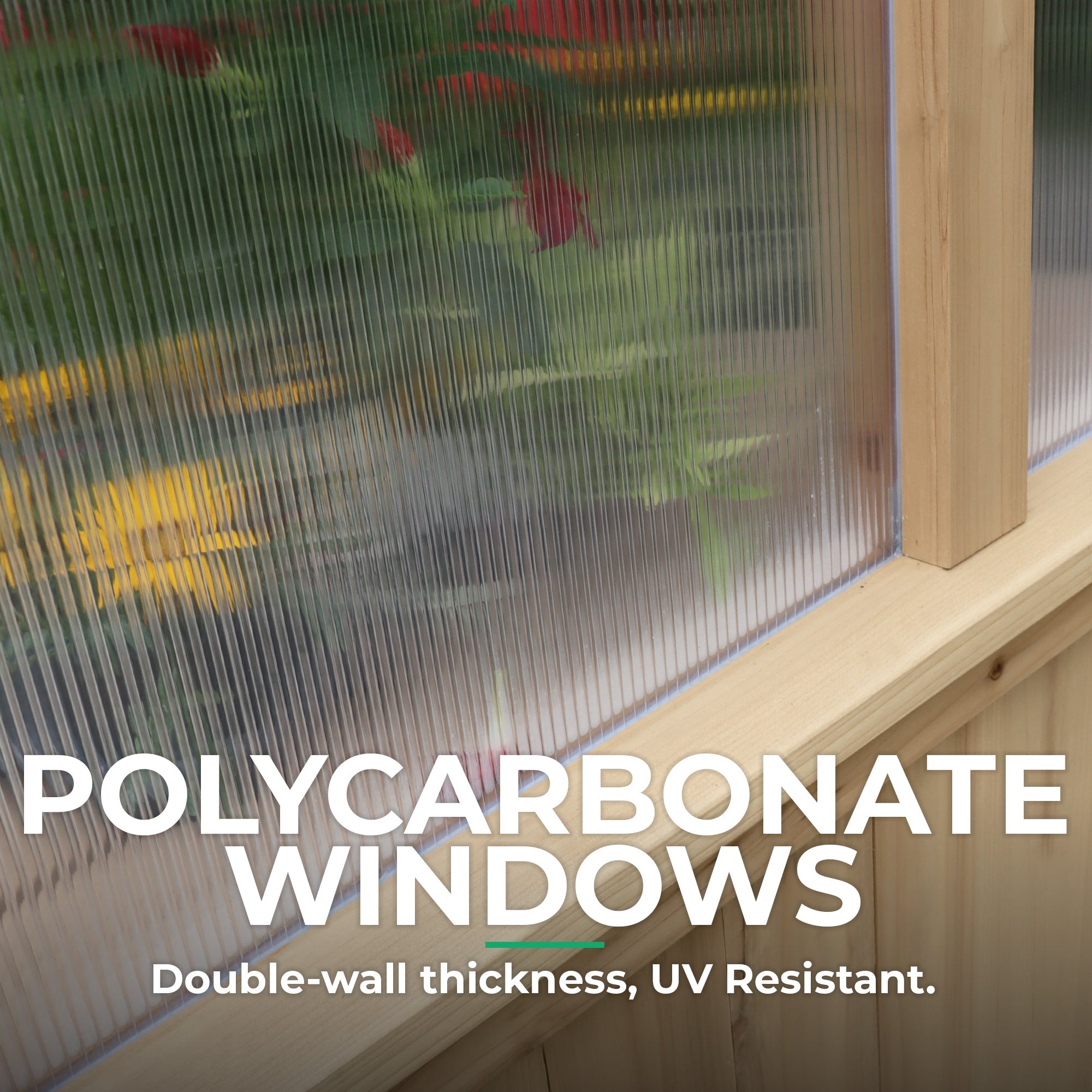 If you love plants and always need to be surrounded by green things, then add 6.7 ft. x 9.7 ft Meridian Greenhouse to your yard. The 32-inch-high cedar base walls are built with sturdy tongue-and-groove construction. They also enable you to store gardening tools away from view. Built into the base walls are a 19-inch wide lower shelf and an 8-inch wide upper shelf. The double-wall polycarbonate windows are strong and durable. Their double-wall construction gives them superior insulation and UV properties that help plants grow. Two heat-sensitive, automatic roof vent opener helps the Greenhouse maintain optimum temperature and humidity levels. A louvered base wall vent enables proper air intake. The cedar door features a latch and closer with a quick-hold feature that keeps the door open when desired. All sections are pre-cut and pre-drilled for easier assembly. The Greenhouse comes with simple-to-follow illustrated instructions, and we’ve created a helpful hints video to make your installation process more straightforward. Yardistry stands by the quality of its products, and 6.7 ft. x 9.7 ft. Meridian Greenhouse comes with a five-year limited warranty.
